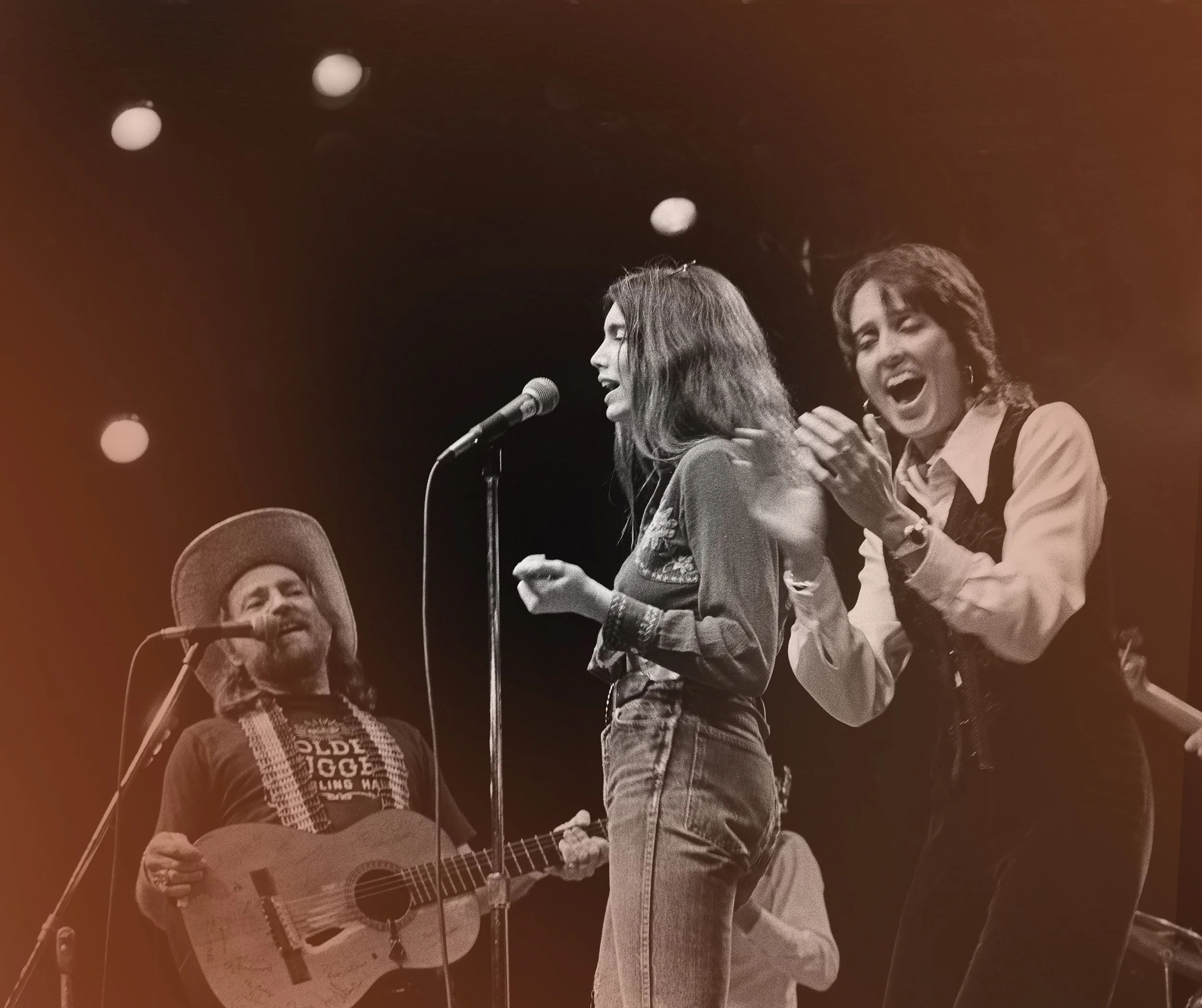 Willie Nelson, Emmylou Harris, and Joan Baez perform at the Circle Star Theatre in San Carlos, California, on March 5, 1976.